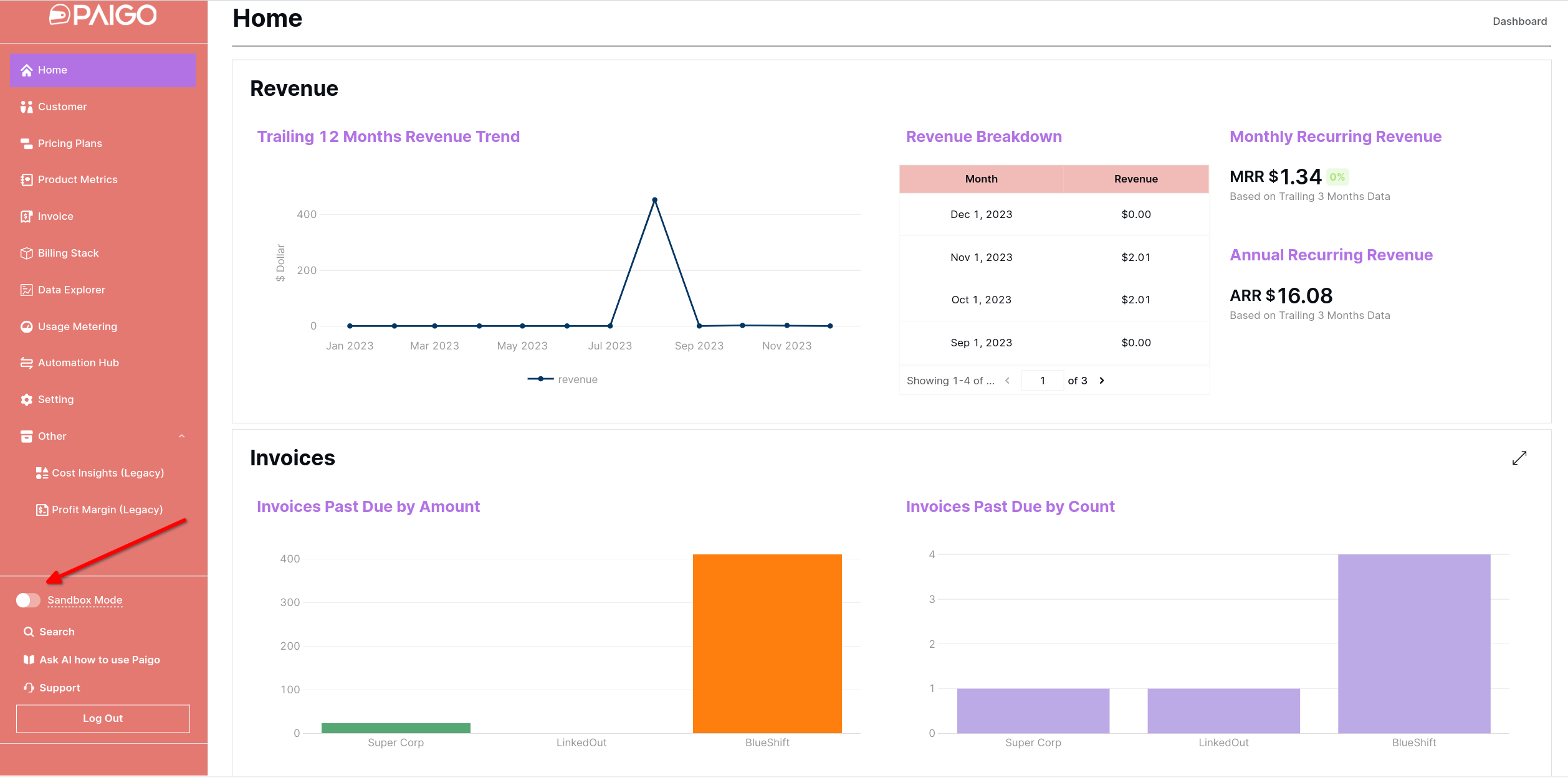 * In sandbox mode, any invoice, processed revenue, or charges against SaaS customers are not counted toward Paigo's metered usage.